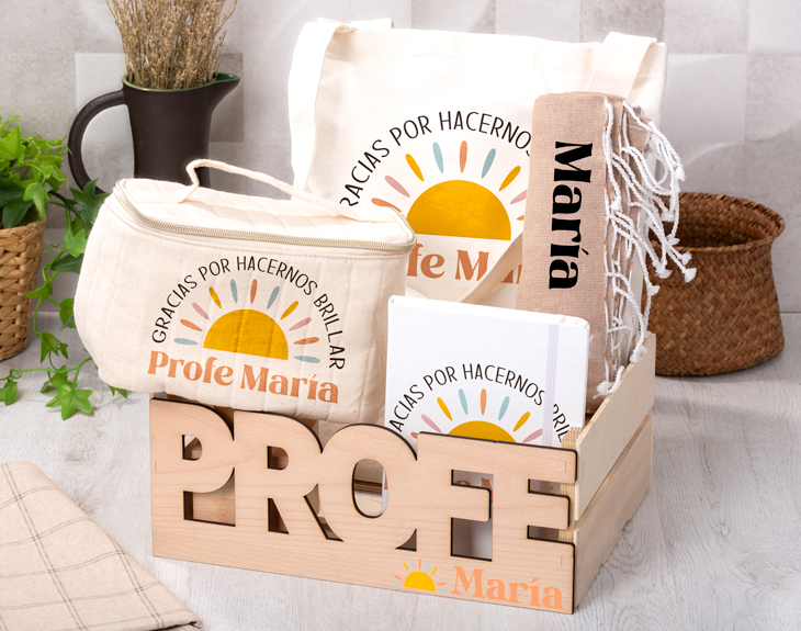 ¿Buscáis un regalo realmente a la altura de vuestra super profe? ¡Os traemos la opción perfecta! Se trata de una caja de madera premium personalizada con una selección de nuestros productos favoritos para este verano. ¡Así podrá desconectar y disfrutar de sus merecidísimas vacaciones! Incluye un bolso, una toalla, un neceser y un cuaderno, ¡todo ello personalizado con su nombre y el diseño más especial! Como sabemos que tan importante es el contenido como la presentación, los artículos se entregarán en una preciosa caja de madera con la palabra "profe" personalizada. ¡Así podrá reutilizarla para guardar sus apuntes! Y es que, si habéis tenido la suerte de tener a la mejor profe del mundo y queréis agradecérselo de la manera más emotiva y especial, este regalo original está hecho para vosotros. Porque solo os ha enseñado un montón de lecciones, os ha hecho crecer y, lo más importante, ¡os ha enseñado a brillar! ¡Se merece todo y más! - Medidas del bolso: 50cm x 36cm x 13cm. - Medidas del neceser: 23cm x 14cm. - Medidas del bloc: 14cm x 21 cm /80 hojas. - Especificaciones de la toalla: 180cm x 90 cm (80% algodón/20ºpoliéster) (Gramaje: 180 g/m².)