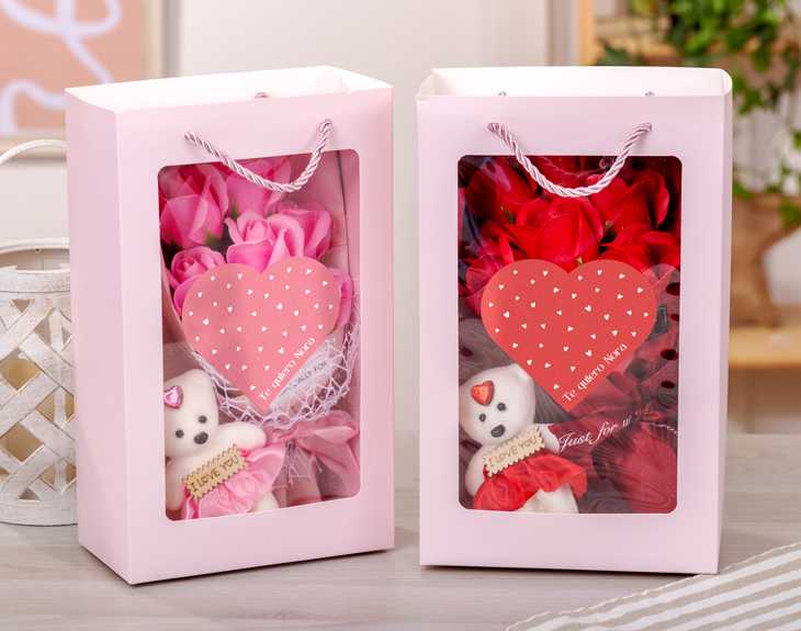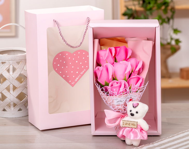 • Bolsa personalizada. • Ramo de flores artificiales aromáticas. • Osito "Love you". • Tarjeta recordatoria.