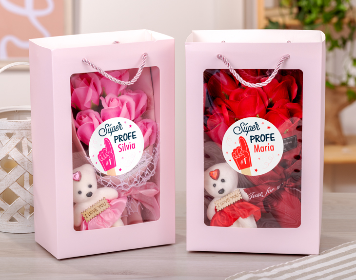 • Bolsa personalizada. • Ramo de flores artificiales aromáticas. • Osito "Love you". • Tarjeta recordatoria.