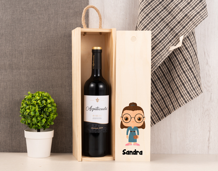 Regalar una botella de cava o vino siempre es una buena opción, pero más aún es hacerlo en una caja de madera personalizada, ¡y ya ni hablamos si está personalizada con nuestra divertida familia Tinok! Así podrá guardar para siempre un precioso recuerdo de ese cumpleaños, ese aniversario o esas navidades. Puedes escoger únicamente la caja para rellenarla con lo que quieras, aunque te recomendamos seleccionar las opciones que incluyen una botella de cava o de vino, ¡así podrás hacer el regalo al completo! ¿Cómo se personaliza? ¡Muy fácil! Solamente tienes que seleccionar el personaje de nuestra familia Tinok que más se parezca a esa persona y decirnos su nombre. Eso sí, si quieres que sea 100% personalizado, lo mejor es que crees su propio avatar desde cero. Sí, has leído bien, con la ayuda de nuestro diseñador podrás crear su personaje totalmente a medida, escogiendo el peinado, el color de piel, de ojos, la ropa y accesorios...¡todo lo que puedas imaginar para que sea exactamente igual a esa persona! Sin duda, cuando vea su personaje le hará muchísima ilusión, y es que se trata de un regalo único y muy original. Lo mejor, es que luego podréis brindar juntos con una copita de vino o cava, celebrando todo lo que habéis vivido y todo lo que está por llegar. ¡No se nos ocurre un planazo mejor que ese! Medidas de la caja: 37, 5 X 10,4 X 11 cm Importante: la caja de madera trae de serie un pequeño círculo superior centrado para abrir cómodamente la caja donde recomendamos no diseñar cosas importantes de la personalización.