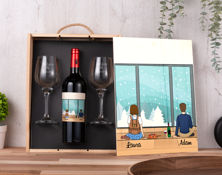 No hay nada como pasar una noche en familia y rodeado de tus seres queridos. Al fin y al cabo, ellos son los que nos alegran cada día con sus historias y su cariño. ¿Te imaginas una cena llena de risas y alegría con motivo de cualquier celebración? ¡Sabemos que es lo único que le falta a esta imagen! Esta caja con vino y copas personalizada es perfecta para tener un momento de felicidad con las personas que más quieres. Esta caja con botella de vino tinto y dos copas con tapa está pensada para todas esas personas a las que les encanta estar en casa y disfrutar de esa compañía que no te da otras personas que tu familia. La caja, con una altura de 37,5 centímetros y una longitud de 29,5 centímetros, está hecha de madera. En su interior encontraréis dos copas de cristal y una botella de vino tinto de 750 mililitros. ¡Un pack elegante y de lo más apetecible! Solo queda decidir cómo quieres personalizar este regalo original. Por un lado, tienes la opción de solo personalizar la tapa de la caja con los miembros de nuestra familia Chill. ¡Podrás elegir aquellos que más se parezcan a vosotros! Después, podrás personalizar también las copas, escribiendo en el diseñador el texto que quieres para cada copa. Finalmente, si también deseas personalizar la botella, podremos hacerlo con los mismos personajes que has añadido en la caja. ¡Un detalle de lo más completo y único! Importante: la caja de madera trae de serie un pequeño círculo superior centrado para abrir cómodamente la caja donde recomendamos no diseñar cosas importantes de la personalización. Altura de las copas: 21 cm. Medidas de la caja: 37,5 x 29,5 cm x 10,5 cm. Material: madera. Capacidad de la botella: 750 ml.