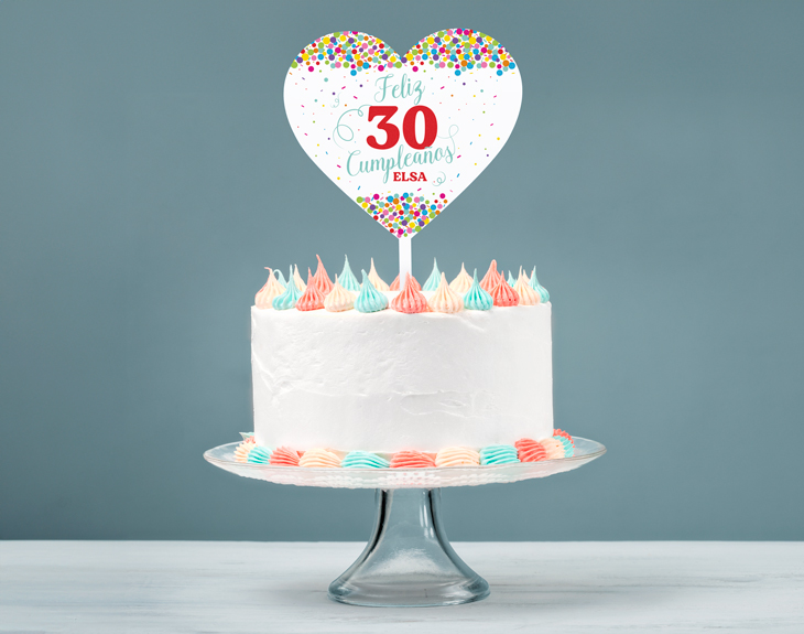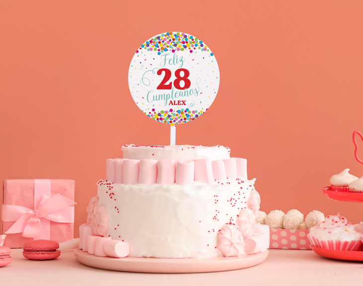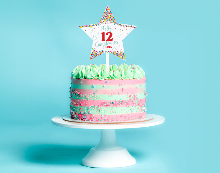 ¿A quién no le gusta celebrar su cumpleaños? Es el día más importante y especial de todo el año, porque te reúnes con tu familia y amigos para celebrarlo, pasar un rato genial, recibir regalos y tomar tarta, mucha tarta. Y es que la tarta es la protagonista indiscutible de todas las fiestas. Por eso, si quieres que sea la mejor, coloca este cake topper personalizado encima de ella y dale un toque único y muy especial. Es una manera genial de que tus invitados se fijen en tu tarta de cumpleaños y les de un poquito de envidia, porque seguro que quieren uno igual. Cualquier fiesta de cumpleaños es perfecta para poner este original cake topper sobre la tarta. ¡Todas se merecen un accesorio tan guay como este! Con su diseño lleno de colores y confeti, todo el mundo sabrá que es tu cumpleaños. Este cake topper está hecho de metacrilato transparente y podrás clavarlo perfectamente en cualquier tarta. Además, podrás elegir qué forma te gusta más: estrella, redonda o corazón. ¡Tú eliges! Pero para que cualquier tarta tenga este toque tan único, no te olvides de personalizar tu cake topper. Primero elige la forma que quieras, añade el producto al carrito y por último escribe el número de años y el nombre del cumpleañero o cumpleañera. ¡Será la estrella de cualquier celebración! Importante: la tarta no viene incluida. Medidas cake topper: - Estrella: 23 x 15 cm. - Corazón: 23 x 16 cm. - Redondo: 23 x 14 cm.