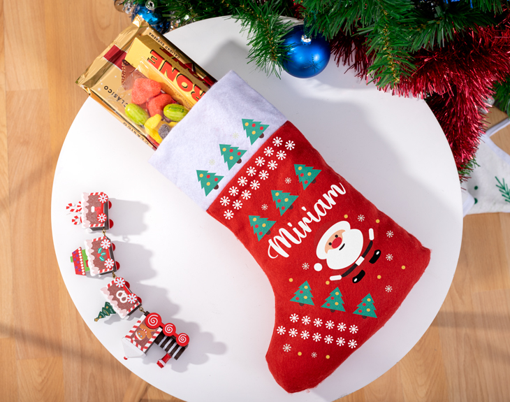 ¡Ding dong! Ya se acerca la Navidad y los alegres personajes de esta mágica época del año ya están llamando a tu puerta. ¿Quién quieres que te acompañe este año? ¿Un sonriente muñeco de nieve? ¿Un regordete Santa Claus? Tú eliges quién va a identificar tu calcetín de navidad personalizado. Escoge con cuidado, ¡él será el encargado de custodiar tus regalos! Tranquilo, para que estén bien a salvo, hemos incluido un gancho rojo bien ancho en lo alto de la bota de Papá Noel para que puedas colgarla de la chimenea o del armario. ¿Cómo puedes hacer la magia de personalizarla? Como si fueras a ponerle nombre a tu muñeco de Navidad escogido, tienes un área de texto en blanco justo encima de él. ¡Pero también puedes moverla hacia donde quieras o cambiarle el tamaño! Con tan solo escribir un breve texto, ya tendrás lista tu bota roja con nombre y diseño navideño. Si la cuidas bien, ¡podrá durarte para muchas navidades más! Da igual que tengas 15 o 55 años: hay un calcetín navideño con texto para ti. ¿Qué mejor idea de regalo original para Navidad o para el amigo invisible que el complemento más típico de estas fiestas? Complementa tu sorpresa añadiendo a la bota de navidad personalizada un delicioso surtido de chuches o 3 tabletas de chocolate Suchard.¡Con sabor a elegir! Material: fieltro rojo y blanco. Altura: 36 cm. Importante: si puedes tener reacción a cualquier tipo de alérgenos, puedes escribirnos para consultar si hay alguna opción alternativa. El calcetín relleno de dulces incluye un turrón Suchard, un Toblerone y una bolsita de chuches, ¡es genial para endulzar estas fiestas!