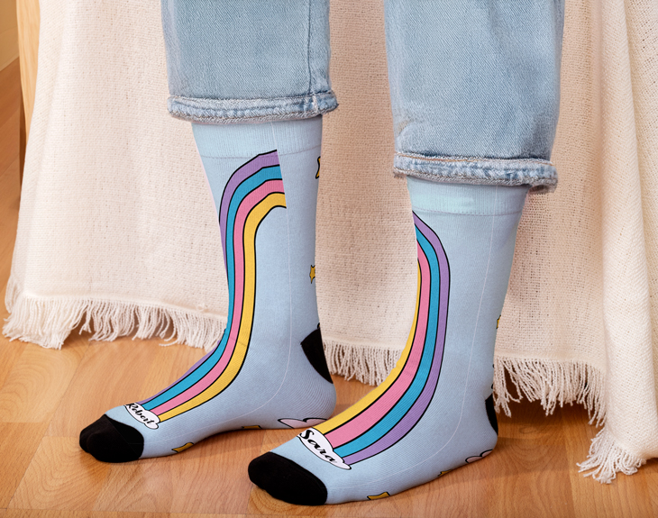 Todos tenemos una persona crucial en nuestra vida, sin la que no podemos vivir. ¡Es como nuestra segunda pierna! ¿Quién es ese gran apoyo para ti, esa persona que te hace sentir como en las nubes? Demuéstrale lo importante que es para ti con estos calcetines personalizados. Podrás personalizar los dos por separado con un nombre cada uno. En cada nube, podrás tener un nombre distinto que solo verá la gente cuando te los quites. Lo que todo el mundo podrá ver este precioso arcoiris que te saldrá del pie. ¡Llena de color tus piernas y tu día a día con este par de calcetines elásticos con diseño a personalizar! Gracias a su color azul cielo, podrás combinarlos con cualquier tipo de zapatillas y pantalones. Algo tan bonito no se puede guardar en cualquier recipiente. Podrás elegir entre la caja básica o lata para calcetines personalizada, sobre la que podrás escribir ya vuestros dos nombres juntos sobre una única nube. ¡Los mejores calcetines para parejas! IMPORTANTE: Talla: única Medidas de cada calcetín: 41x9 cm. Medidas de la caja: 13,5x10,5x4 cm. Medidas de la lata: 11x8,5 cm. Material: poliéster