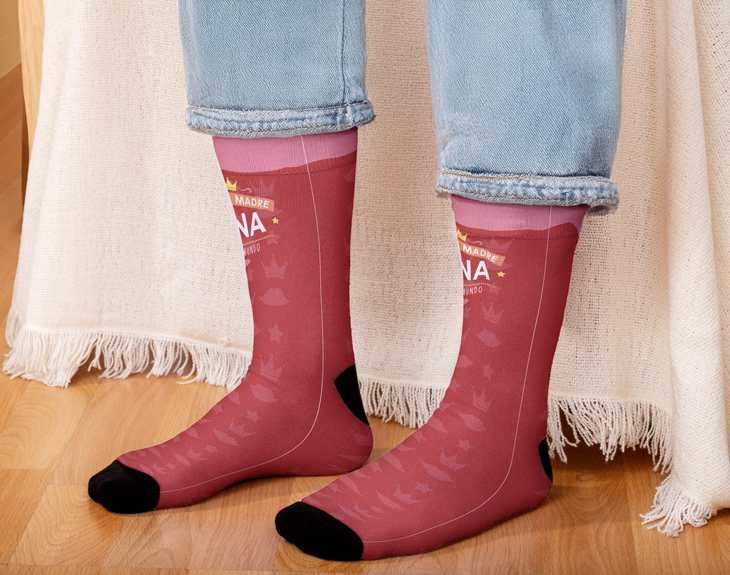 Una reina como tu madre no puede vestir de cualquier manera. ¡Se lo merece todo y más! Ya sea que salga a la calle o simplemente para estar en casa, haz que presuma de sus propios calcetines personalizados. Dale todo tu amor con este diseño de iconos rojos y rosas: besos, estrellas, coronas... Todo es poco para la mejor madre del mundo. ¿Quieres dedicarle un mensaje personalizado para el Día de la Madre o para su cumpleaños? Escribe su nombre sobre este par de calcetines elásticos con diseño a personalizar. Lo único que tienes que hacer es añadir el producto al carrito, y podrás ver en la previsualización lo bonito que queda su nombre rodeado de estrellas. ¡Lo tendrá así en las dos piernas! Bien visible para que, aunque lleve puestas las zapatillas, todo el mundo pueda ver que es la mejor mamá de todas. Si quieres complementar tu sorpresa de buen hijo/a, podrás entregarle su regalo sobre esta caja básica o lata para calcetines personalizada. En esta última, podrás también escribir su nombre o ese apodo cariñoso con el que siempre la llamas. IMPORTANTE: Talla: única Medidas de cada calcetín: 41x9 cm. Medidas de la caja: 13,5x10,5x4 cm. Medidas de la lata: 11x8,5 cm. Material: poliéster