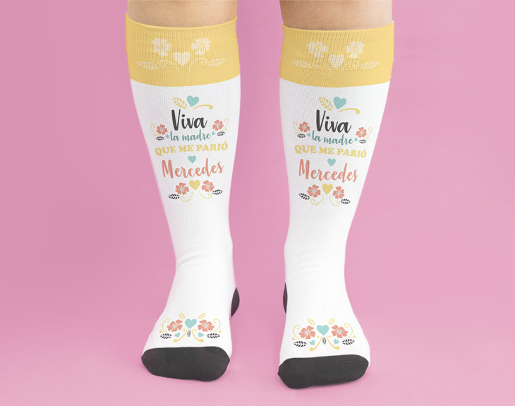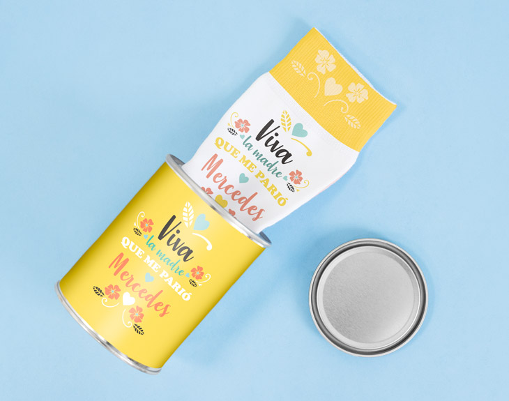 ¿Te cuesta acertar con la ropa para regalar a tu madre? Hay una prenda en la que dará igual el estilo que suela llevar y lo importante será el mensaje que le dediques. Sea como sea tu mamá, seguro que la sorprendes con estos calcetines personalizados. ¡Con un motivo de flores y corazones impreso a todo color con amarilllo! Más allá de sus bonitos colores y su comodidad, lo mejor será el mensaje original para el Día de la Madre o para su cumpleaños. Escribe su nombre sobre este par de calcetines elásticos con diseño a personalizar. Así, podrás decirle lo mucho que celebras su vida y que te haya cuidado tantísimo. ¡No sabrá si ponérselos para estar en casa y salir a la calle o enmarcarlos para verlos todos los días! En este tipo de detalles originales para madres, cada detalle cuenta. ¡Hasta la presentación! Por ello, podrás entregarle los calcetines con su nombre sobre esta caja básica o lata para calcetines personalizada. IMPORTANTE: Talla: única Medidas de cada calcetín: 41x9 cm. Medidas de la caja: 13,5x10,5x4 cm. Medidas de la lata: 11x8,5 cm. Material: poliéster