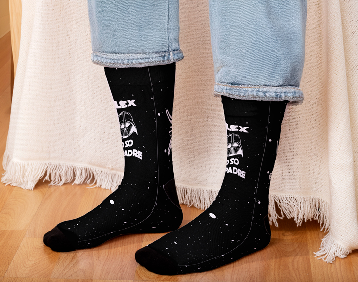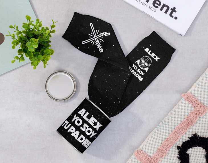 Si tu papá fue el que te enseñó a amar la mejor saga de películas de todos los tiempos... ¡La Guerra de las Galaxias! Entonces, está claro que este regalo tiene su nombre. Estos calcetines personalizados con el diseño "Yo soy tu padre" son el detalle perfecto para ese papá fanático de Star Wars. Un regalo original y divertido que querrá lucir desde el primer minuto que los vea. Lo mejor de estos calcetines originales es que son personalizables: podrás añadir el nombre de tu papá para hacerlo aún más único. Además, puedes optar por comprar solo los calcetines, o añadirle una lata personalizada con su nombre, para que siempre los guarde en un lugar especial y digno de un verdadero Jedi. Estos calcetines elásticos son de talla única, por lo que se adaptan perfectamente a cualquier papá, ¡y su diseño es tan único como él! Personalizar estos calcetines tan originales es muy sencillo. Solo añade el producto al carrito, entra en el área de personalización, y añade el nombre de tu papá. En un abrir y cerrar de ojos, tendrás el mejor regalo para el Día del Padre. ¡Un detalle que hará que tu papá se sienta como el auténtico héroe de la galaxia! IMPORTANTE: Talla: única Medidas de cada calcetín: 41x9 cm. Medidas de la caja: 13,5x10,5x4 cm. Medidas de la lata: 11x8,5 cm. Material: poliéster.