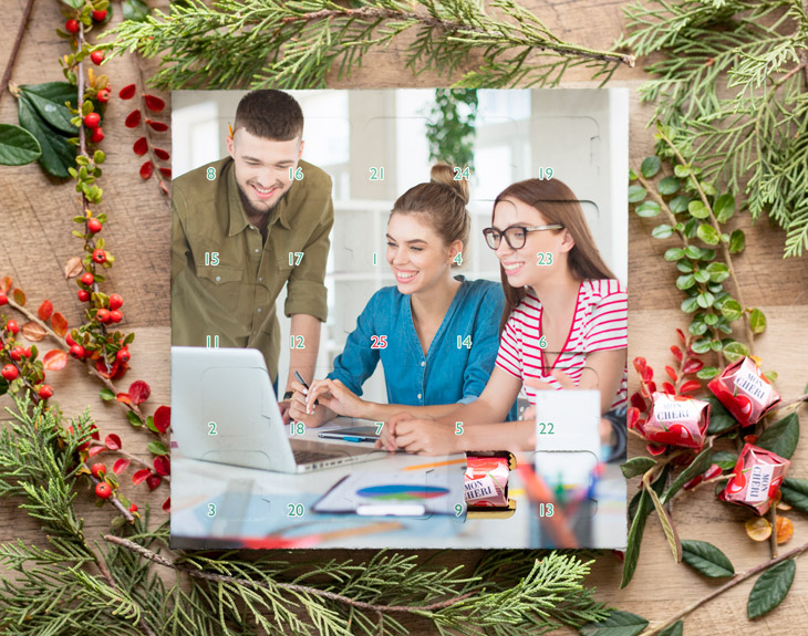 La mayoría de las empresas buscan siempre un regalo original para celebrar los distintos eventos. Son lo que llamamos regalos para empresas. Cuando llega la Navidad, es muy común que cada uno tenga en su casa, de manera individual, un calendario de adviento para celebrar las fiestas y disfrutar en familia de una de las tradiciones más dulces: encontrar el día que es y comer la chocolatina o sorpresa que haya dentro de cada caja. Es muy divertido hacerlo en casa con la familia, pero, ¿has probado a hacerlo en tu empresa? Este regalo para empresas es lo más para Navidad. Puedes personalizarlo con una foto de tu departamento. ¡Eso sería genial! Engaña a tus compañeros y sacaos una foto todos juntos... ¡Ya tendrás regalo de departamento para estas navidades! Solo tendrás que recopilar la foto que más te guste, añadirle algún texto si quieres, y disfrutar de este calendario de adviento personalizado para empresas. Si tu departamento es pequeño, con un calendario para compartir valdría, pero, ¿qué pasa si quieres más de uno para repartir por toda la empresa? En Regalo Original contamos con ello, y por eso, recopilamos distintas opciones para obtener un presupuesto. Esto te lo contarán si escribes a eduardo@regalooriginal.com y preguntas por el presupuesto para cantidades que quieras de los calendarios de adviento para empresas. Es momento de ponerse manos a la obra a pensar y organizar la campaña de Navidad. Y, al igual que como grupo corporativo hay que preparar cosillas, también hay que hacerlo de manera interna. Por eso, pensamos que este regalo para empresas puede ser una opción genial de alegrar los días navideños en la empresa, y hacer ver que los compañeros también son amigos y que todos nos lo podemos pasar bien trabajando juntos. Tamaño aproximado: 22,50x22,50 cm