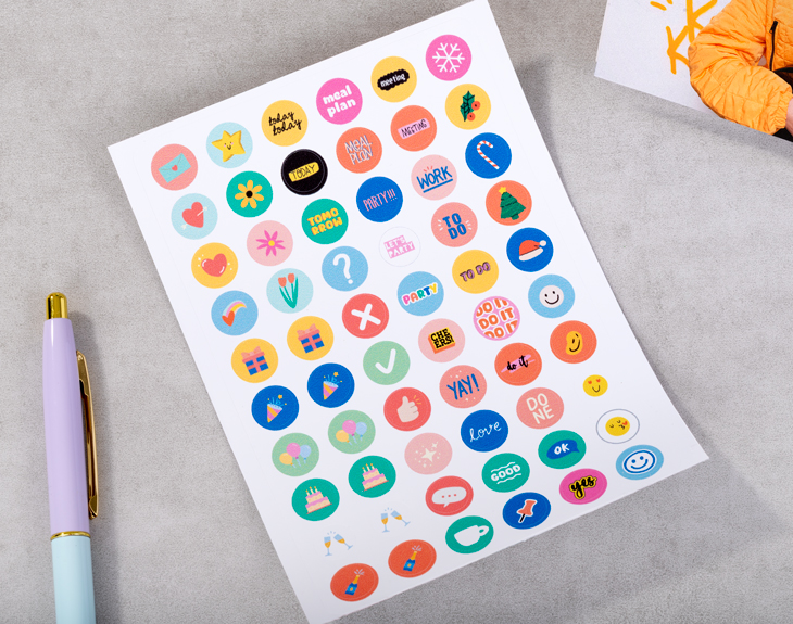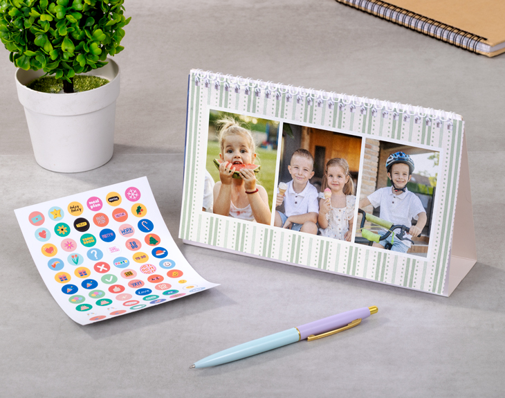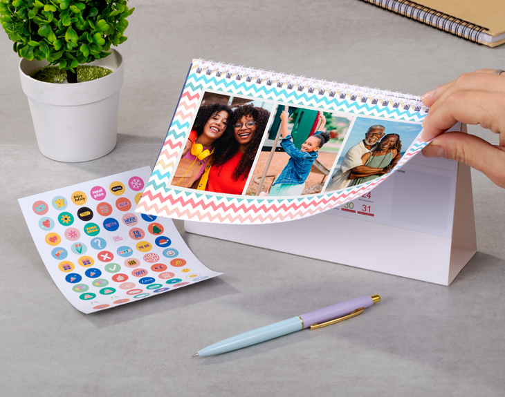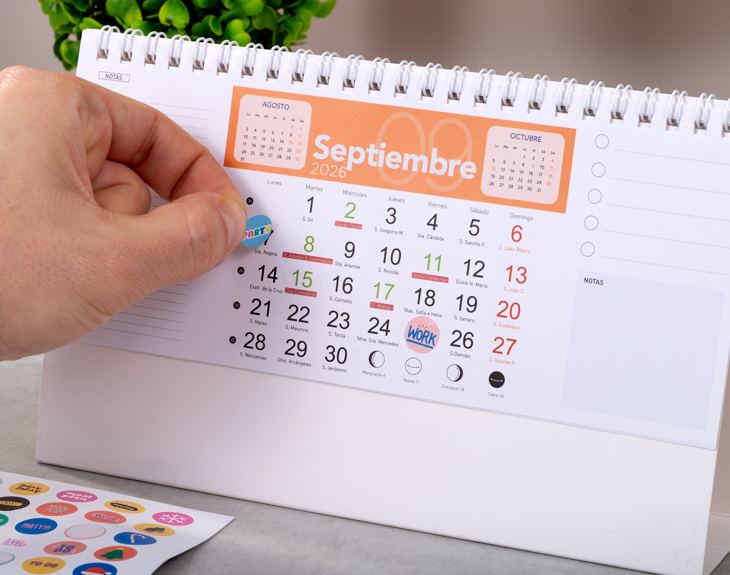 • Calendario de mesa rectangular personalizado. • Plancha de stickers (opcional). • Tarjeta recordatoria.