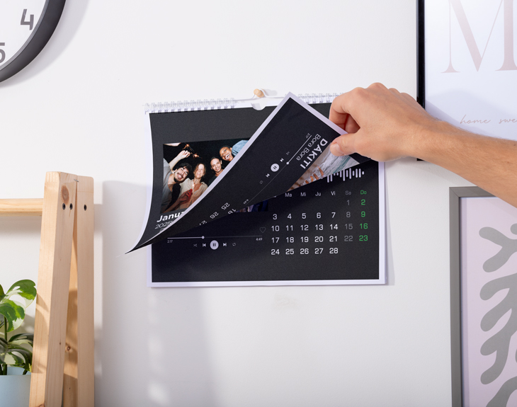 Si siempre has soñado con tener una vida de película y tener hasta tu propia banda sonora, tenemos algo que te va a encantar. Con nuestro calendario de pared personalizado con diseño "Spotify" lo conseguirás. Además, este calendario viene genial para que puedas apuntar todos los cumpleaños de tus seres queridos y todas esas cosas que tienes programadas cada mes. Lo más especial de este calendario, sin duda, es que es personalizable. Cada mes del año, además de personalizarlo con una foto especial, podrás incluir el código de una canción de Spotify que capture la magia de esa momento del año. Es ideal como regalo para sorprender a tu pareja o a esa persona amante de la música. ¡Es perfecto para esas personas que viven su vida al ritmo de sus canciones favoritas! Por último, personalizar este calendario es muy sencillo. El primer paso a seguir consiste en añadir el producto al carrito y entrar al área de personalización. Una vez ahí, ya puedes escoger las fotos que quieras junto con las canciones y decorar este calendario tan personal. Pronto estará perfecto y listo para regalar. ¡Será un original regalo! - Tamaño A4