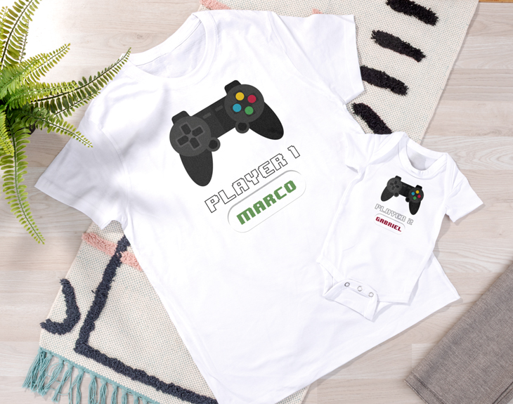 ¿No te gustaría compartir tus aficiones con tu hijo? Da igual lo pequeño que sea: desde su primer mes, ya puede ser el bebé más friki de toda la galaxia. Instrúyele en los caminos de los videojuegos y las aventuras sin necesidad de una pantalla con este divertidísimo pack de camiseta y body personalizados. Así ambos podréis ir a juego, pero cada uno con su propio nombre y color. ¡Como si fuerais los avatares de un juego de la Play Station! Por supuesto, nos adaptamos a todas las tallas de adulto e infantiles que tengamos disponibles y que podrás elegir desde el carrito. Al final, estas camisetas son las que tu padre conservará con el paso del tiempo cuando a ti ya no te entre el body. Escoge su color favorito y escribe su nombre o su apodo cariñoso con el que siempre le llamas: papi, papichi... Sea lo que sea, verás en todo momento una previsualización del resultado final de estos diseños frikis para padres e hijos. ¡Puedes personalizar cada uno por separado! Así podéis elegir qué jugador ser cada uno y qué color de ropa llevar. ¿Tienes un amigo que acaba de tener un hijo/a? Ya llegará el día en que puedan jugar juntos a la videoconsola. Pero hasta entonces, lo que más ilusión le hará es algo como este regalo original para padres e hijos. ¡Porque es tan importante regalar al bebé como al padre que lo cuida! Material: - Algodón: 100% algodón. Importante: Las medidas son aproximadas, pueden variar 5cm por encima o por debajo.