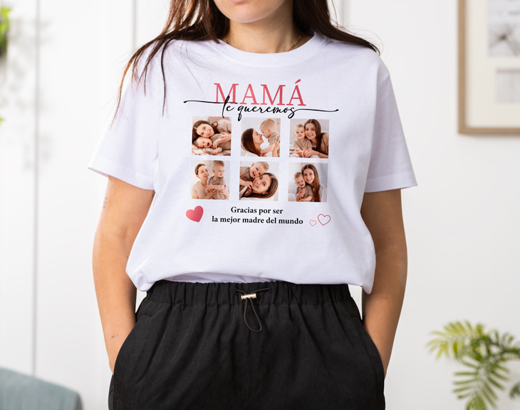 ¿Cuáles son los mejores momentos que has vivido junto a la mujer de tu vida? Y no, no nos referimos a tu pareja... ¡Si no a tu madre! Mamá y tú habéis estado juntos desde el mismo momento de tu nacimiento, en los buenos y en los malos momentos de vuestra vida. Esa gran mujer siempre ha estado ahí para todo, y se merece una celebración por todo lo alto. Y es que para eso está el Día de la Madre. El primer domingo de mayo es el día en el que honramos y agradecemos a todas las madres todo lo que han hecho por nosotros. Una buena comida, muchísimas risas y recuerdos... ¡Y sobre todo un regalo! Mamá no se puede ir de vació en este día, por lo que tenemos un detalle que resulta tan útil como emocionante. ¡Una camiseta personalizada como esta le hará revivir viejos tiempos! En esta camiseta con collage de fotos podréis recordar vuestros mejores momentos juntos. Primero, escoge qué tipo de camiseta quieres (técnica, de algodón, sin mangas, sudadera...). Después solo tendrás que entrar en el diseñador y escoger las fotos perfectas para este detallazo. Súbelas a nuestro sistema y añádelas al diseño. ¡Podrás escribir un agradecimiento y todo! Estamos seguros de que este regalo original le encantará a mamá. Material: - Algodón: 100% algodón. - Tacto algodón: 100% poliéster cotton touch. - Técnicas: 100% poliéster. Importante: Las medidas son aproximadas, pueden variar 5cm por encima o por debajo.