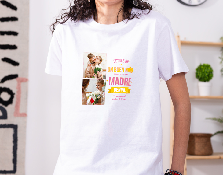 Tu madre es genial porque te tiene a ti, porque tiene la suerte y el privilegio de tener un hijo o hija como tú. Y es que la principal razón por la que una madre es lo que es son sus hijos. Por eso, si queréis tener un detalle único con mamá, sorpréndela con esta camiseta personalizada. es el regalo perfecto para decirle que es la mejor y la madre más genial del mundo. Además, podrás añadir vuestras fotos favoritas, así este regalo terminará de conquistar el corazoncito de tu madre. A veces puede ser complicado regalar a mamá y acertar, pero con esta original camiseta acertarás seguro. Es un regalo único y perfecto para el Día de la Madre o su cumpleaños. Le encantará recibir un regalo tan especial y hecho especialmente para ella. Lo mejor es que podrás elegir el tipo de prenda que quieras: camiseta, sudadera, manga larga, manga corta... ¡Hay para todos los gustos! Personalizar esta camiseta es muy fácil. Lo único que tienes que hacer es elegir la prenda que quieres, añadir el producto al carrito y comenzar a crear tu diseño. En la plantilla que te dejamos añade tus fotos favoritas y escribe una breve dedicatoria en la parte inferior del diseño. Así de fácil es crear tu propia camiseta para mamá. ¡Será el mejor regalo del mundo! Material: - Algodón: 100% algodón. - Tacto algodón: 100% poliéster cotton touch. - Técnicas: 100% poliéster. Importante: Las medidas son aproximadas, pueden variar 5cm por encima o por debajo.
