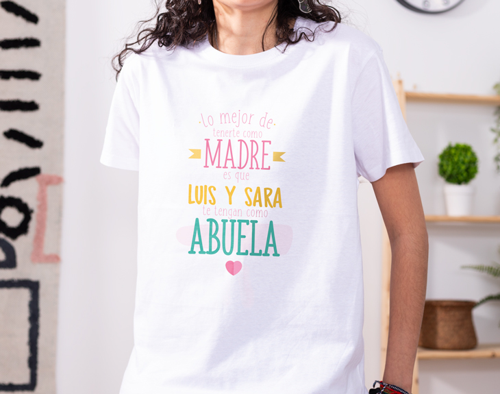 Si tu mamá ya es abuela y es la mejor abu del mundo mundial, esta camiseta personalizada es perfecta para darle una sorpresa enorme. Solo necesitamos los nombres del nieto o de los nietos y el regalo estará listo para sorprender. Aprovecha el Día de la Madre, el Día de los Abuelos o el cumpleaños de la yaya para sacarle una sonrisa preciosa. ¡Ahora es el momento! Material: - Algodón: 100% algodón. - Tacto algodón: 100% poliéster cotton touch. - Técnicas: 100% poliéster. Importante: Las medidas son aproximadas, pueden variar 5cm por encima o por debajo.