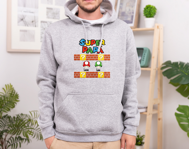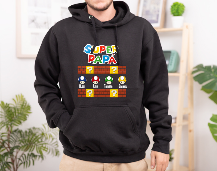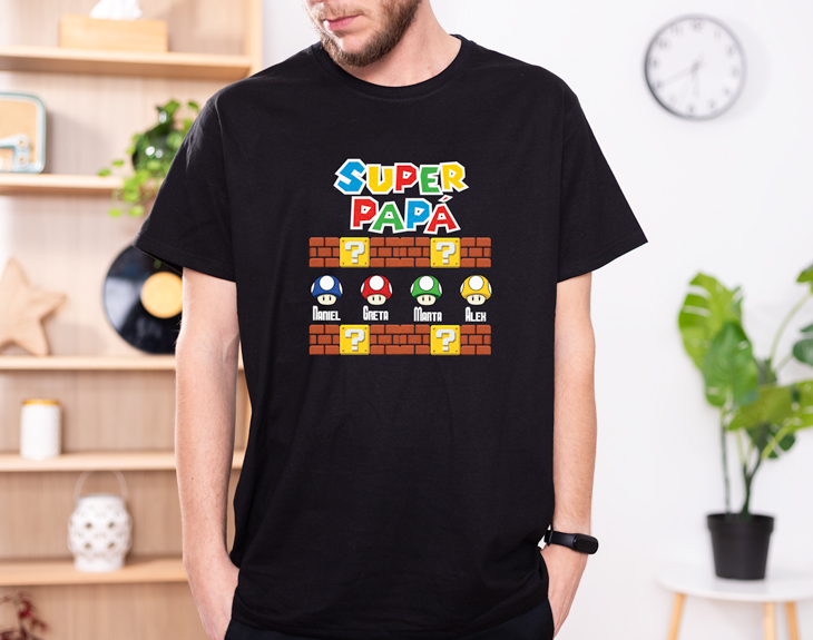 ¿Vuestro papá es un auténtico héroe? ¡Entonces esta divertidísima camiseta personalizada tiene su nombre! Y es que, si además desde siempre ha sido muy fan de Mario Bros, este diseño con vuestros nombres le encantará. Dadle una sorpresa en el Día del Padre y regaladle su nueva camiseta preferida, ¡no se la querrá quitar nunca! Para personalizarla, solamente tendréis que elegir el número de nombres que queréis incluir y el color (blanco o negro). Tened en cuenta el color de la camiseta a la hora de escoger el diseño, os recomendamos coger nombres blancos para las camisetas más oscuras y viceversa. Una vez seleccionado podréis añadirlos justo debajo de los míticos champiñones de Mario Bros, ¡quedará chulísima! Si tenéis la inmensa suerte de tener al mejor papá del mundo y lleváis tiempo queriendo tener un detalle con él para agradecerle todo lo que hace por vosotros, este regalo original es la opción perfecta. Podéis aprovechar cualquier fecha señalada o, mejor aun, aparecer cualquier día con esta camiseta, ¡se morirá de emoción al verlo! Material: - Algodón: 100% algodón. - Tacto algodón: 100% poliéster cotton touch. Ligeramente traslúcida - Técnicas: 100% poliéster. Importante: Las medidas son aproximadas, pueden variar 5cm por encima o por debajo.