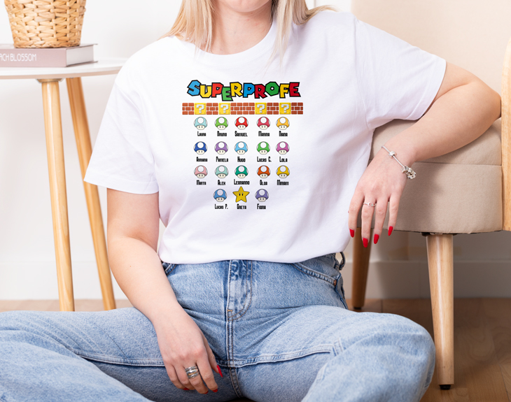 Hay miles de profes en el mundo dedicados en cuerpo y alma a darlo todo en el trabajo que aman pero seguro que no hay ninguno como el vuestro. Si este año ha sido todo un súper profe y os ha enseñado un montón de cosas, se merece una sorpresa tan especial como esta camiseta personalizada inspirada en el conocido Mario Bros. Podrás personalizarla añadiendo tantas setas como alumnos tenga y colocar en el centro la estrella que será el profe. ¡Cada figura llevará su nombre! Si queréis triunfar con el mejor profe del mundo ahora que se acerca fin de curso, este original regalo es todo lo que necesitáis. Tanto padres como alumnos podéis regalarle a vuestro profe esta camiseta tan guay, aunque también podéis elegir la prenda que más os guste: de manga corta, de manga larga o incluso una sudadera. ¡Hay para todos los gustos! Esta súper camiseta es totalmente personalizable, por lo que tendrá el diseño que más os guste. Crearlo es muy sencillo. Solo tenéis que elegir la prenda que más os guste y comenzar a añadir pequeños Toadettes para representar a cada alumno y coronar con la estrella que será vuestro profesor o profesora. A cada figura tendréis que añadirle un nombre diferente y listo. ¡Será el mejor regalo del mundo! Material: - Algodón: 100% algodón. - Tacto algodón: 100% poliéster cotton touch. - Técnicas: 100% poliéster. Importante: Las medidas son aproximadas, pueden variar 5cm por encima o por debajo.