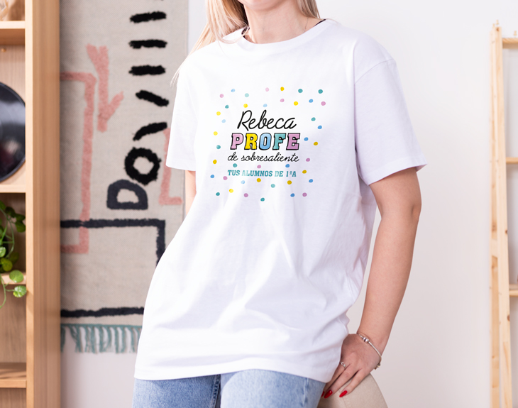 En fin de curso es muy común hacerle un regalo a ese profesor que lo ha dado todo en sus clases. Si ha sido un profe sobresaliente con todos sus alumnos se merece tener esta camiseta personalizada con un diseño de lo más guay. Si tenéis el mejor profesor del mundo, el que más os ha enseñado y que más paciencia ha tenido con vosotros, esta camiseta está hecha para él. Se convertirá en su prenda favorita y será la envidia de los demás profes. Si queréis ser los mejores alumnos del mundo y agradecerle a vuestro profe su dedicación durante este año, no hay mejor manera de hacerlo que con esta original camiseta y su diseño especial para profesores. Elige qué prenda quieres: camiseta, manga corta, manga larga, sin mangas, sudadera... ¡Y dile que es un profe sobresaliente! Esta camiseta se convertirá en su prenda favorita y cada vez que la lleve a clase será el profe más guay del mundo. ¡Tendrá un recuerdo único! Personalizar esta camiseta es muy sencillo. Elige el tipo de prenda que quieres, añade el producto al carrito y escoge qué gama de colores te gusta más para este diseño. Después, podrás escribir el nombre de tu profe y lo que quieras en los demás espacios vacíos. Ajusta todo para que quede perfecto y listo. ¡Tendrá el mejor regalo! Material: - Algodón: 100% algodón. - Tacto algodón: 100% poliéster cotton touch. - Técnicas: 100% poliéster. Importante: Las medidas son aproximadas, pueden variar 5cm por encima o por debajo.