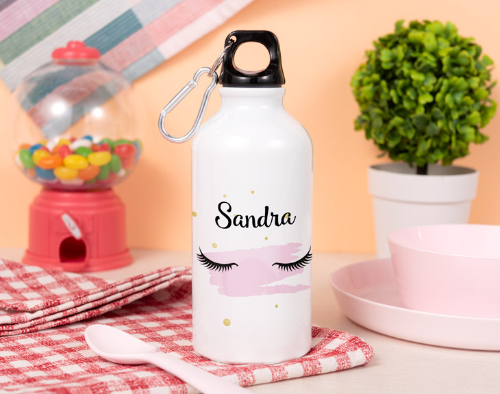 Si tu amiga, hermana o hija va a comenzar a ir a el instituto, trabajo o gimnasio ¡haz que empiece divina y bien! Con esta cantimplora de aluminio personalizable con diseño "Lashes". Este diseño de pestañas no la defraudará ¿a quién no le gustaría tener unos pestañones? En ella podrás poner el nombre que quieras o una breve frase que te inspire. Esta cantimplora es un regalo muy original con el que acertarás seguro. Está hecha a base de aluminio y es muy cómoda y manejable mide tan solo 17 centímetros de altura y una capacidad de 400 mililitros. Incorpora un mosquetón para que puedas engancharla en cualquier sitio y te sea fácil de transportar a cualquier parte, de esta manera evitarás perderla. Este regalo original para ella, además de incluir un diseño hecho para las más glamurosas, también se podrá personalizar con su nombre o el apodo que quieras. ¡Podrá incluir el nombre de la mujer más afortunada! Solo tendrás que escribir su nombre en el diseño que encontrarás en el apartado de personalización. Su nombre aparecerá en el diseño. Seguro le encantará.