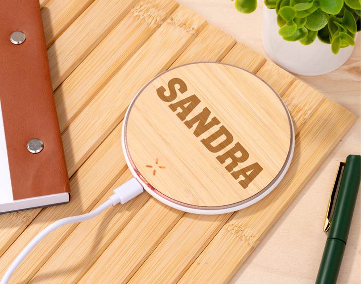 El cargador inalámbrico personalizado para los amantes del medio ambiente y de las cosas bien hechas. Solo tendrás que darnos el nombre que quieras y lo grabaremos para que puedas sorprender a esa persona tan especial. ¿Tienes un amigo o amiga que siempre te pide el cargador del móvil? ¡Este es el regalo perfecto! Tendrá el móvil siempre cargado allá donde esté. ¿Qué más puede pedir? Si es su cumpleaños dentro de poco o si, simplemente, te apetece darle una sorpresa original, este es el momento. Importante: es responsabilidad del cliente comprobar si su teléfono es compatible con el sistema de carga inalámbrica. Luz roja: correctamente conectado y listo para su uso. Luz azul: carga inalámbrica en curso. Diámetro: 9,5 cm. Distancia de funcionamiento: hasta 6mm. Entrada Micro USB: 5V-2A Salida carga inalámbrica: 5V-1A,5W Apto para todos los dispositivos móviles con tecnología Qi. Recomendamos retirar fundas y otros intermediarios entre el terminal y el cargador.