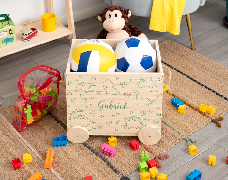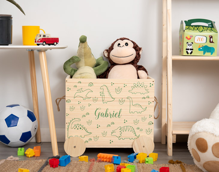 Los niños tienen que disfrutar de su infancia al máximo y jugar todo lo que puedan antes de hacerse mayores. Su principal diversión es crear sus propias historias y mundos con sus juguetes y vivir una aventura diferente cada día. Pero después de jugar toca recoger los juguetes y cosas que han utilizado. Para evitar que tus hijos lo dejen todo por ahí tirado, necesitan este carrito de madera personalizado. El regalo más práctico y útil del mundo para los pequeños de la casa, porque gracias a él será súper fácil para ellos guardar todos sus juguetes. ¡Siempre los tendrán a mano para el siguiente día! Enseñar a los peques a recoger y ser ordenador es algo muy importante para ellos, para que consigan vivir en orden. Gracias a este original carrito para juguetes conseguirán mantener su espacio de juegos ordenado. Este carrito hecho de madera es perfecto porque combina con cualquier decoración y quedará perfecto en cualquier habitación. ¡Cuenta con dos ruedas y dos asas de cuerda! Si a tu hijo o hija le encantan los dinosaurios, podrás personalizar este carrito con un diseño lleno de ellos. Lo primero que tienes que hacer es añadir el producto a la cesta. Después, elige el color del diseño de dinosaurios (verde, azul o rojo) y después escribe el nombre que quieras en el espacio vacío. ¡Así de fácil es tener el mejor carrito para juguetes del mundo! Medidas: Altura: 32 cm. Ancho: 40 cm. Diámetro de la rueda: 10 cm.