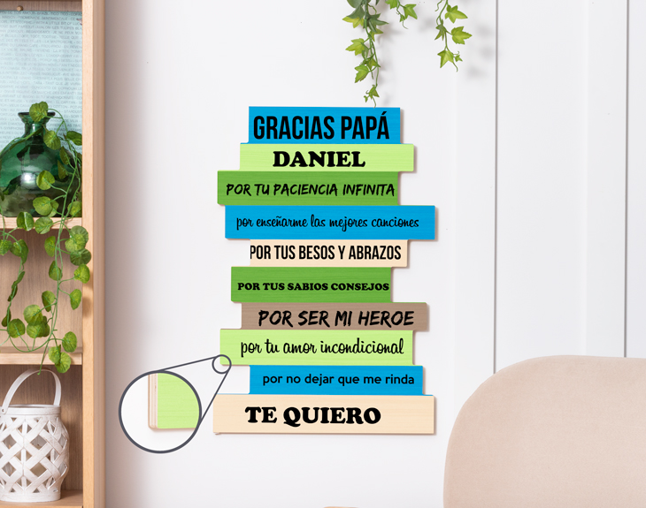 No hay cariño que se pueda acercar al que siente un padre por sus hijos. Al fin y al cabo son sangre de su sangre, y les ha visto crecer a lo largo de los años. Seguro que todos los hijos sacan alguna moraleja o enseñanza de sus padres todos los días, creando y formando una personalidad a partir de la de él. ¡Los padres son importantísimos en la vida de cualquier niño! Hay muchas razones por las que darle las gracias a papá: por darnos de comer todos los días, por cuidarnos en los peores momentos, por la confianza que nos proporciona... ¿y acaso hay mejor día para agradecérselo que el 19 de marzo? Nosotros creemos que no, por lo que contamos con este cartel de madera personalizado con el que sorprenderás al mejor papá del mundo. Este producto es una dedicatoria personalizada para una de las personas más importantes de tu vida. Podrás personalizar este cartel de madera con cualquier cosas, como sus frases más icónicas o todas esas enseñanzas que siempre te dice. Encontrarás diferentes colores para tu cartel... ¡Escoge el que más te guste para este regalo original para el día del padre! Material: madera. Medidas: 39 cm x 59 cm. Importante: Las maderas tienen vetas y éstas pueden quedar reflejadas en la impresión.