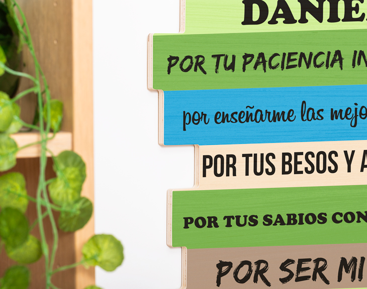 • Cartel de madera personalizado. • Tarjeta recordatoria.