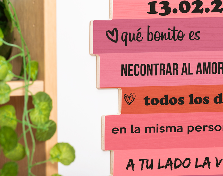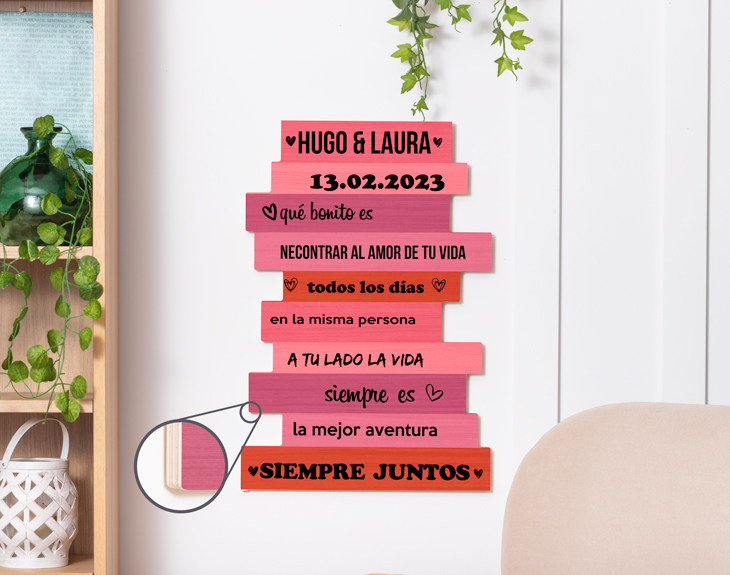 Qué pena que las palabras sean tan efímeras para transmitirle a tu pareja lo mucho que la quieres. Seguro que podrías estar todo el día diciéndole las frases más bonitas del mundo, ¡y aún así te faltaría tiempo! Queremos ayudarte a que le recuerdes tu amor cada día de la manera más original y romántica posible. Para ello, puedes inmortalizar todos tus sentimientos sobre este cartel de madera personalizado para que lea tus piropos cuando más los necesita: cada día al llegar del trabajo, por las mañanas al levantarse, cuando no estéis juntos... ¡Siempre es buen momento para decir "te quiero"! Sabemos que no os valen las típicas frases de películas y que vuestro amor es más especial que cualquiera de ellas. Por ello, os damos libertad para expresar vuestro amor con vuestro propio lenguaje. Añade el producto al carrito y crea desde cero con toda la facilidad de nuestro sistema tu propia dedicatoria romántica personalizada. Podrás ver en tiempo real cómo quedará y crear un diseño con vuestros nombres, fechas y frases tan bonito como el de nuestro ejemplo. ¡Con corazones incluidos! Piensa bien qué promesas y confesiones quieres imprimir sobre este fondo rosa y rojo porque va a ser como vuestra relación: ¡para siempre! Gracias a su grosor de unos pocos centímetros, podréis ponerlo de pie en cualquier sitio de vuestro salón o colgarlo en la pared con el agujero para colgar en la parte trasera. Aunque sea un regalo original para San Valentín, ¡el regalo será recordarle cada día lo mucho que le/la quieres! Material: madera. Medidas: 39 cm x 59 cm. Importante: Las maderas tienen vetas y éstas pueden quedar reflejadas en la impresión.