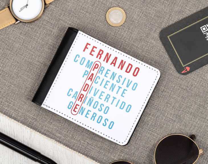 Si te digo las siguientes características: comprensivo, paciente, cariñoso, divertido y generoso, ¿Quién es la persona que primero se te viene a la mente? ¡Seguro que en tu Papá! Si tu padre es un 10/10 y cumple con todas estas características, ¿qué mejor forma de cuidarle que con este regalo tan original? Se trata de nuestra cartera personalizada, ideal para demostrarle todo el amor que tienes para él y para que sepa cuanto lo admiras y valoras. En ocasiones es complicado sorprender a nuestros padres, siempre queremos ser originales y que sea el regalo perfecto. Sin duda, esta cartera es ideal para cualquier fecha señalada, como su cumpleaños, el Día del Padre, para un amigo invisible o simplemente para tener un detalle con él por ser el mejor papá del mundo. ¡Le encantará! Si al fin te decides a hacerle este regalo, aquí te explicamos cómo personalizar la cartera. El primer paso es añadir el producto al carrito y entrar al área de personalización. Una vez ahí puedes escribir el nombre de tu padre. Nosotros nos encargamos de quede perfecto y listo para regalar. Material: polipiel. Medidas aproximadas: 11,5 x 9,5 cm (cerrada) 23 x 9,5 cm (abierta)