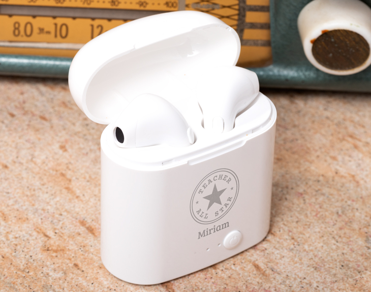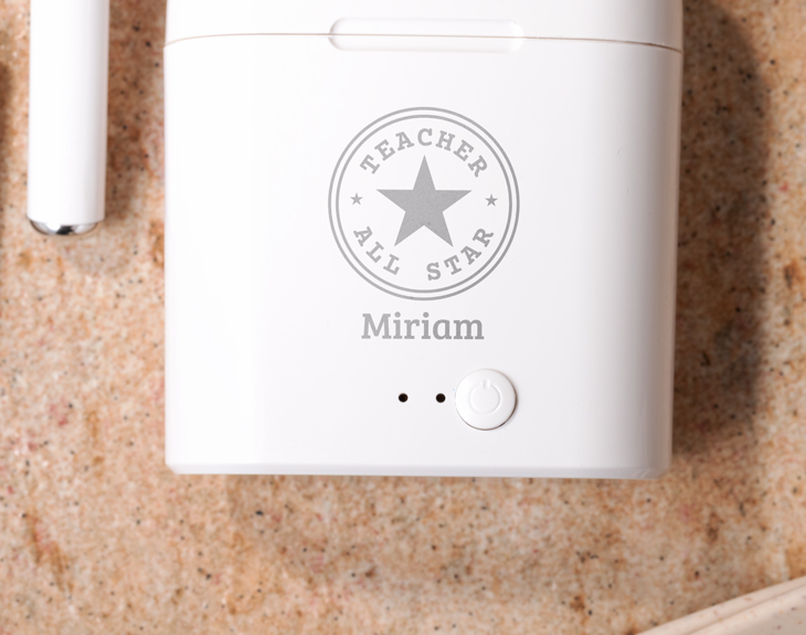 ¿Buscas un regalo que, además de original, sea muy útil para ese profesor que es todo un All Star? ¡Tenemos la solución perfecta! Nuestros cascos inalámbricos personalizados, con un diseño inspirado en las clásicas zapatillas All Star y el nombre del profe, son la opción ideal. Así podrá disfrutar de su música favorita mientras prepara las clases o se relaja después de un día intenso, sin pelearse con los cables enredados de los auriculares tradicionales. Porque, ¿quién no ha perdido tiempo desenrollando cables? Con estos cascos inalámbricos, ese problema desaparecerá. Un regalo original y práctico para ese profesor que siempre está a la altura, un auténtico All Star de la enseñanza. ¿Cómo conectar tus auriculares?: La primera vez que conectes los auriculares debes asegurarte que tienen suficiente batería. Extrae ambos auriculares del estuche de carga y automáticamente se encenderán y entrarán en modo sincronización. Una vez estén sincronizados, los indicadores LED azul y rojo comenzarán a parpadear alternamente. Eso significa que la sincronización se ha realizado correctamente. Desde el menú Bluetooth busca el dispositivo 3037 para asociarlo a tu teléfono. Una vez emparejados correctamente, los indicadores LED se apagarán. Importante: Para que tus cascos se carguen completamente debes usar un cargador con salida 5V/2A. Importante: Cuando uses tus auriculares para hablar por teléfono, solo se escuchará a través de un auricular, mientras que si los utilizas para escuchar música se oirá por ambos cascos. Medidas: 5 x 5 x 2,5 cm. Controles: -Responder/Colgar una llamada: Pulse una vez el botón multifunción. -Rechazar una llamada: Mantenga pulsado el botón multifunción. -Rellamada: Pulse dos veces el botón multifunción de forma consecutiva para marcar el número de la última llamada. -Reproducir/Pausar música: Pulse una vez el botón multifunción. -Cambio de pista: Pulse durante dos segundos el botón multifunción para pasar a la siguiente pista.