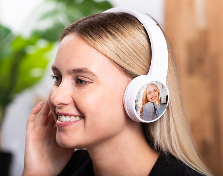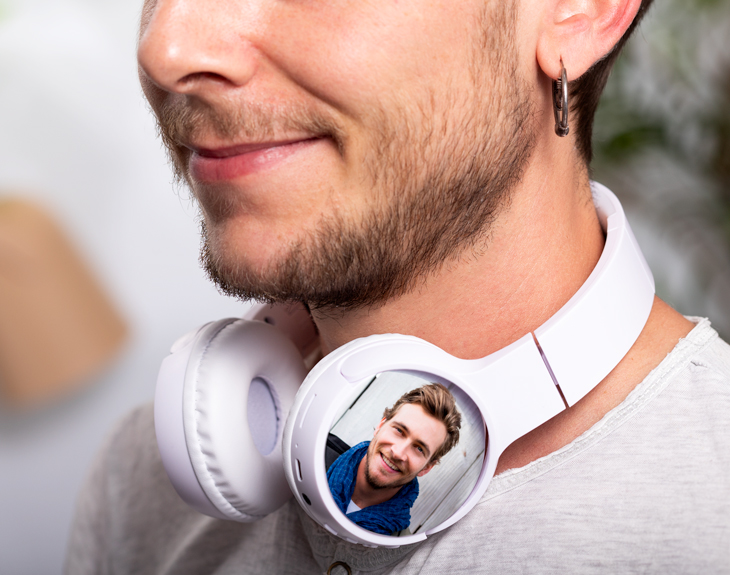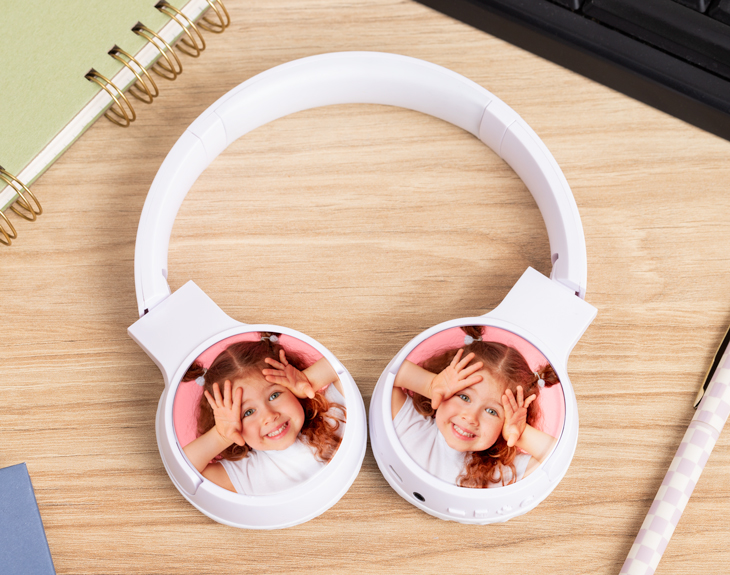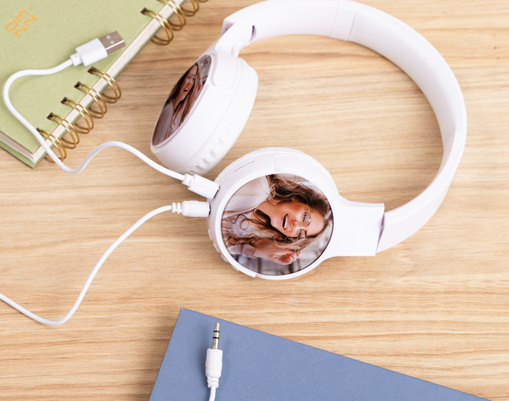 Cascos personalizados. Auriculares personalizados con tus fotos. Puedes poner una foto distinta de cada lado. Clavija de 3,5 mm. Características: - Compatible con todos los dispositivos digitales de 3,5 mm. - Ajustable para adaptarse a todos los tamaños de cabeza. - Enchufe USB. Conexión Jack 3.5 mm. - Longitud del cable USB: 27 cm. - Longitud del Jack: 105 cm. Importante: este modelo no incluye micrófono.
