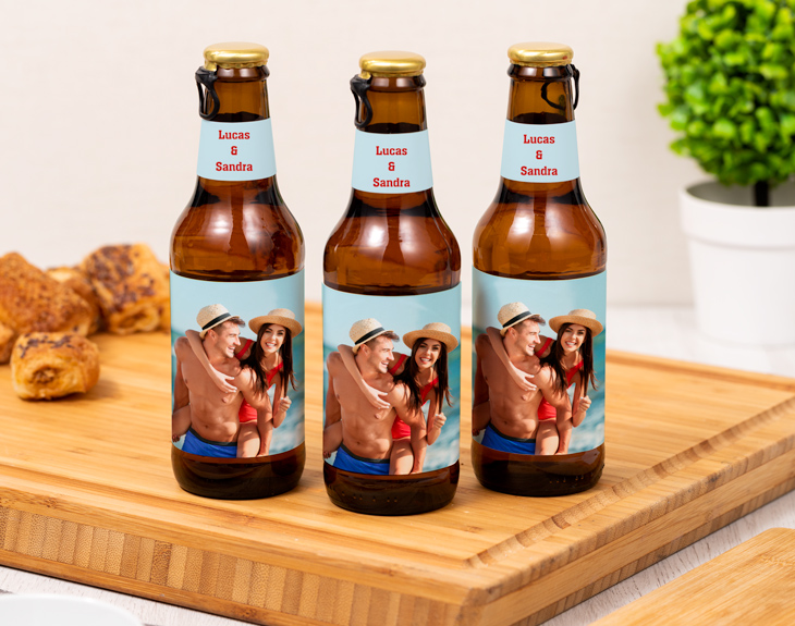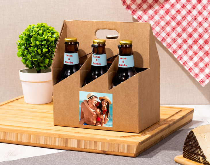 El regalo perfecto para un amante de la cerveza no podría ser otro que su propia cerveza. Y nosotros te damos la oportunidad de sorprender a esa persona especial con este six pack personalizado. Utilizando como base seis botellines de deliciosa San Miguel Especial, personalizamos la etiqueta con la foto y el texto que tú nos digas. Serán así unas cervezas únicas e irrepetibles. Seguro que se queda sin palabras cuando abra la caja y se encuentre con esta increíble cerveza personalizada. Podrás elegir si quieres personalizar las seis cervezas con el mismo diseño para todas o con un diseño diferente para cada una de ellas.