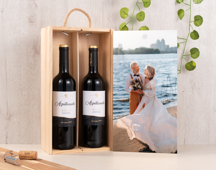 Seguro que nunca le regalaron unas botellas en una caja tan personal. Importante: la caja de madera trae de serie un pequeño círculo superior centrado para abrir cómodamente la caja donde recomendamos no diseñar cosas importantes de la personalización.
