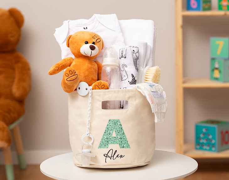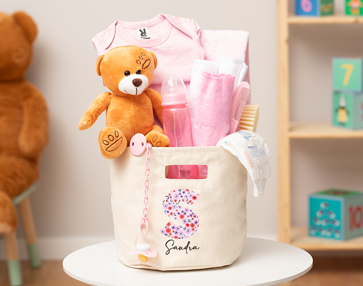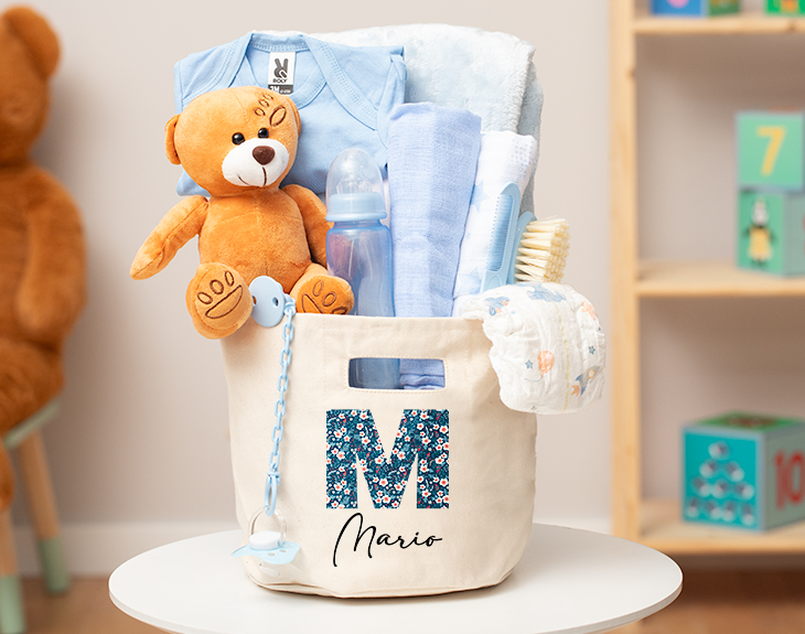 Después de unos meses largos de embarazo, por fin, ha llegado el momento más esperado: ¡tu familia tiene un nuevo miembro! Y es que, la llegada de un bebé siempre es una gran noticia, se convertirá en un recuerdo inolvidable. Si quieres hacerles un regalo a los padres para celebrarlo, nuestra cestita personalizada para bebés es ideal. ¡Les encantará! Esta cesta personalizada es genial, está repleta de productos dedicados al cuidado de recién nacidos. Contiene una mantita, pañales, un osito de peluche, un biberón, un body... Y un montón de cosas más para que al bebé no le falte de nada. Está claro que estos padres primerizos te lo agradecerán un montón. ¡Sorpréndeles con esta cesta tan completa! Y lo mejor, es el estampado personalizado tan bonito que tiene. Tiene el diseño de una inicial de nuestro alfabeto florecitas, puedes elegir el color que más te guste. Y juto debajo puedes poner el nombre que tú quieras. Para personalizar esta cestita, el primer paso a seguir consiste en añadir el producto al carrito y entrar al área de personalización. ¡Un original regalo de nacimientos! Medidas aproximadas: - Cesta Diámetro: 21,5 cm Altura: 21 cm - Manta: 99 x 75cm - Body: talla 3 meses.