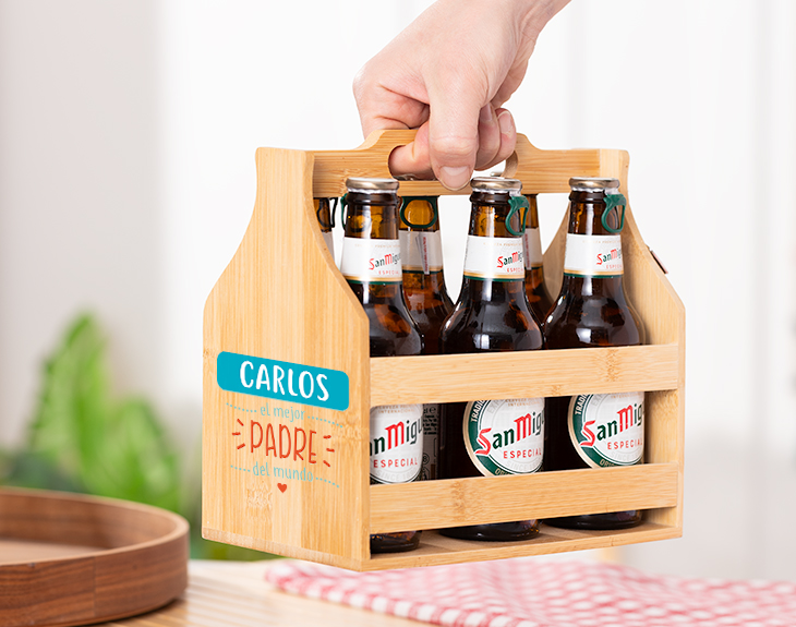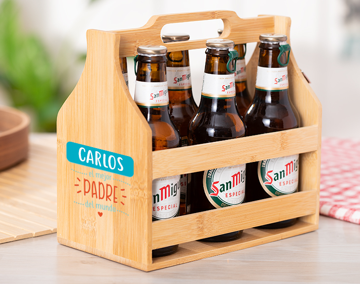 Si tu padre es un fan absoluto de la cerveza, anímate a sorprenderle con un regalo de categoría. Con nuestra cesta de madera para cervezas Mejor Padre del Mundo, le dejarás sin palabras. Personaliza la cajita con su nombre y seguro que la conservará para siempre. Esta preciosa caja de cervezas personalizada tiene un estilo vintage de lo más espectacular. Cuenta con una cajita de madera oscura y un mango de metal para poder moverla. A un lado, encontraremos un práctico abrebotellas, también de metal, que nos ayudará a disfrutar más cómodamente de nuestras cervezas. Llénala con hasta 6 de tus botellines de cerveza favoritos y llévala al centro de la mesa en una reunión familiar o de amigos, ¡seguro que los dejas a todos boquiabiertos! Además, para hacer aún más completo tu regalo original, tienes la posibilidad de encargar la cesta de madera con 6 botellines de la marca San Miguel Especial. Empaquetaremos el regalo con mimo y llegará directo a la dirección que nos indiques para dejar un recuerdo imborrable en tu padre. La personalización del regalo consiste en una pegatina que adherimos en uno de los lados de la cesta de madera con el nombre de tu padre y la frase más bonita: “El mejor padre del mundo”. Solo tienes que anotar su nombre en la plantilla de diseño y nosotros trasladamos esa personalización directamente al vinilo del regalo. Sorprender a nuestro padre en su cumpleaños o en días especiales como el día del Padre no es nada fácil pero, con detalles tan bonitos y cargados de sentimiento como este, seguro que no podrás fallar. Cuando lo abra y lea la personalización, seguro que se emociona al saber lo mucho que le valoráis. Medidas: 15x19,5x22cm. Material: madera. Importante: Las maderas tienen vetas y estas quedan reflejadas en la imagen.