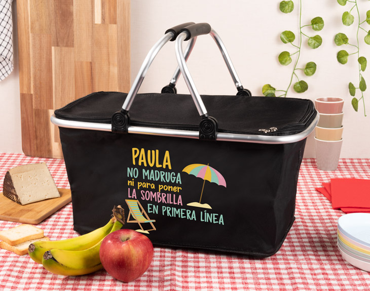 Cuando se acerca el verano, los días soleados y las altas temperaturas, no hay nada mejor que pasar un día en la playa. Tomar el sol, bañarte en el agua, descansar debajo de la sombrilla para no quemarte... ¡es todo un planazo! Por eso, si eres de los que pasa los días enteros en la playa, necesitas esta cesta plegable personalizada porque será tu mejor aliado. Con esta cesta no necesitas preocuparte de llevar bolsas y más bolsas porque podrás meter todo lo que necesites para ese estupendo día de playa. Tanto si eres de esas personas que madrugan para pillar un buen sitio en la playa como si eres de los que van directamente a comer, esta original cesta está hecha para ti. Es el accesorio perfecto para poder llevar tu comida y bebida y que siempre se mantenga bien fresquita, porque cuenta con aislamiento térmico en su interior. Además, esta cesta es plegable por lo que podrás guardarla en cualquier sitio y que no moleste. ¡Lo tiene todo! Y para que quede constancia de que no eres de esas personas que madruga para ponerse en primera línea en la playa, personaliza tu cesta plegable con esta frase si a ti también te representa. ¡Es súper fácil! Añade el producto al carrito, entra en el apartado de personalizar y escribe el nombre de esa persona que prefiere la cama antes que la playa. Además, podrás elegir el color del diseño entre las tres opciones que te proponemos. ¡Le encantará recibir este regalo! Medidas: 47,5 x 27,5 x 21 cm.