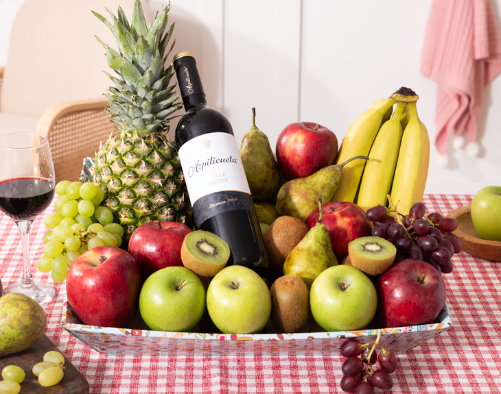 La cesta de fruta Enocultura une lo mejor de la fruta fresca y del buen vino. El regalo perfecto para los amantes del caldo de los dioses, en la cesta se incluye una botella de vino y deliciosas frutas en su estado óptimo de maduración. Además, de manera opcional puedes agregar dos copas grabadas. ¿Te imaginas la sorpresa que supondrá abrir la puerta y recibir esta cesta de fruta gigante? ¡Seguro que se queda sin palabras! Nuestro equipo selecciona en mercados de proximidad las mejores piezas, para que la persona que reciba este regalo se sienta tan especial como merece.
