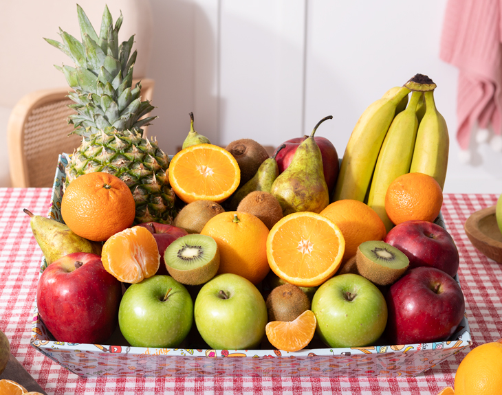Los aromas y sabores del mediterráneo, de la huerta a la casa de esa persona especial gracias a nuestra cesta de fruta Mediterránea. Naranjas y mandarinas valencianas, acompañadas de muchas otras frutas para convertirse en el regalo perfecto para todas las ocasiones. ¿Te imaginas la sorpresa que supondrá abrir la puerta y recibir esta cesta de fruta gigante? ¡Seguro que se queda sin palabras! Nuestro equipo selecciona en mercados de proximidad las mejores piezas, para que la persona que reciba este regalo se sienta tan especial como merece. Importante: En función de la temporada las mandarinas se sustituirán por otro tipo de fruta.