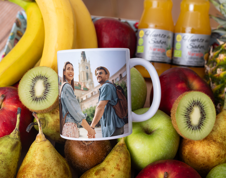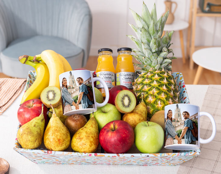 Si buscas un regalo único, la cesta de fruta con tazas personalizadas es la opción ganadora. En una cesta de deliciosa fruta fresca se incluyen dos zumos ecológicos y dos tazas personalizadas. Puedes poner la foto o el texto que quieras. ¿Te imaginas la sorpresa que supondrá abrir la puerta y recibir esta cesta de fruta gigante? ¡Seguro que se queda sin palabras! Nuestro equipo selecciona en mercados de proximidad las mejores piezas, para que la persona que reciba este regalo se sienta tan especial como merece.