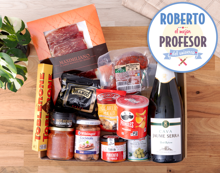 ¿Cuántos momentos de estrés habrán pasado los profes este año? Todo lo acontecido a lo largo de este año ha hecho que este curso escolar se convierta en todo una montaña rusa de idas y venidas. Protocolos que seguir, exámenes que corregir, ejercicios de matemáticas que planear y enseñar a sus estudiantes, etc. ¡Seguro que ha tenido una lista de tareas increíblemente larga! Es el momento de sorprenderle. El mejor profesor del universo se merece un regalo original que le deje con la boca abierta, y que siempre le haga recordar uno de los cursos escolares más curiosos de su vida. Si ese maravilloso maestro ha hecho todo lo posible por sus estudiantes este año, tenemos el producto ideal para este sorpresón: nuestra cesta gourmet personalizada "Mejor profesor del universo". Da igual si este profe es más de dulce o salado, o si es más de ibéricos que de chocolate. En el interior de esta cesta gourmet encontrarás una variedad de productos gastronómicos de excelente calidad que le dejará en shock. Jamón de Jabugo, chorizo, Toblerone, paté... ¡todo lo necesario para dar una sorpresa al mejor maestro del universo! Personaliza la caja de cartón kraft con su nombre, para que tenga un regalo único en el mundo entero. Importante: La marca del vino puede variar según stock.