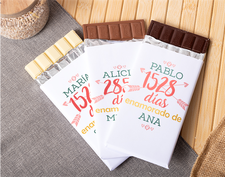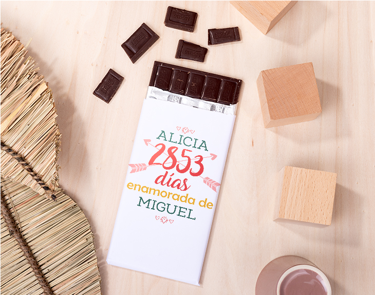 Si estás enamoradísimo de tu pareja, y quieres dejar constancia de que llevas muchísimo tiempo pensando que eres la persona más feliz por poder compartir la vida juntos, esta tableta de chocolate personalizada es perfecta para darle una sorpresa. Calcula cuántos días llevas enamorado de tu pareja, y personalizaremos la tableta para que la recibas lista para sorprender. Es un regalo muy dulce para las parejas más juguetonas. Chocolate negro y leche: 125 gr. Chocolate blanco: 200 gr.