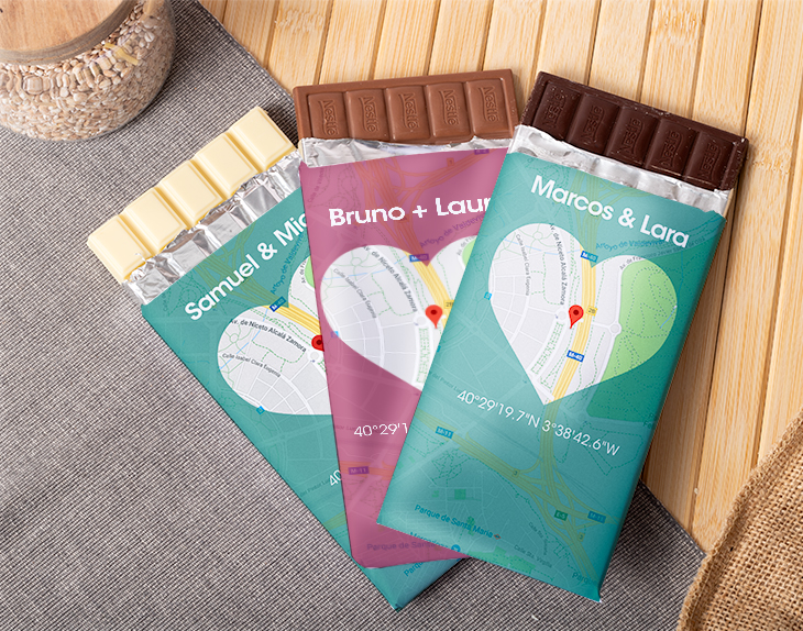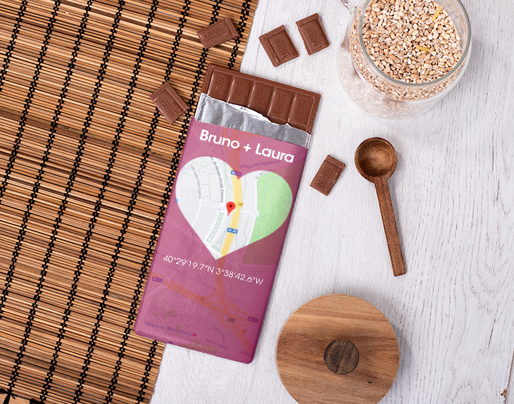 Tableta de chocolate personalizada con la ubicación que tú nos digas: donde os disteis el primer beso, donde os conocisteis o donde sea. ¡Un auténtico mapa de amor! La tableta incluye además vuestros nombres y las coordenadas. Al adquirir el producto (y antes de pagar) se te preguntará por la personalización y el tipo de chocolate (con leche, blanco o negro). Chocolate negro y leche: 125 gr. Chocolate blanco: 200 gr.