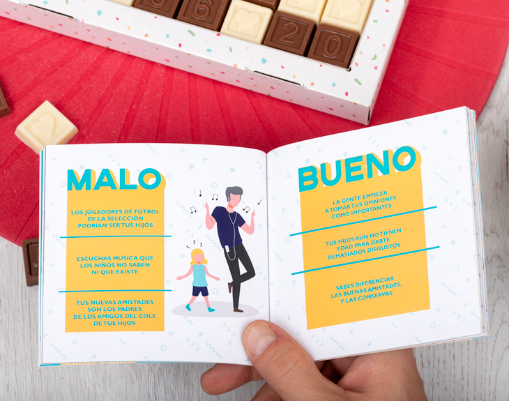 ¡Los 50 son los nuevo 20! Si no queda nada para que a alguien importante para ti se inaugure en la cincuentena y quieres que comience de la mejor manera, este regalo original tiene su nombre. Solamente tienes que decirnos el texto para personalizar el choco mensaje y harás que su día sea aún más especial. Además, se morirá de la risa al leer el libro e identificarse con todas las las frases. Porque seguro que ir a pasear se ha convertido en su ejercicio favorito, solo piensa en la jubilación y las nuevas tecnologías son todo un enigma imposible de descifrar. Tenemos disponibles dos tipos de chocomensajes, uno de 24 caracteres y otro de 32. Medidas: - Tamaño de cada letra de chocolate: 2,3cm x 2,3cm - Tamaño de la caja confetti: 23cm x 11cm x 2,5cm