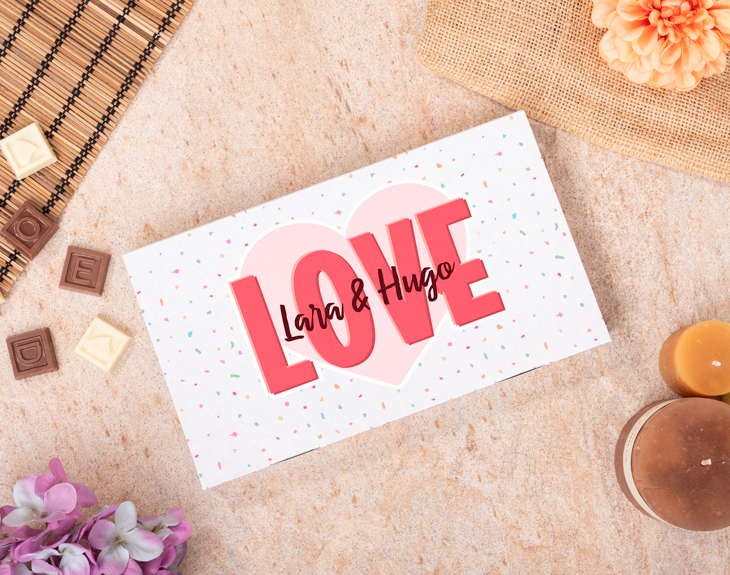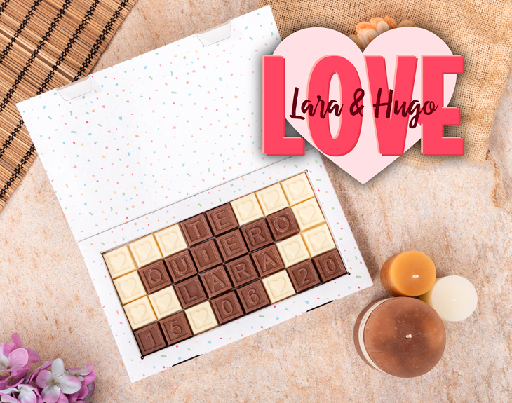 El regalo más especial para la persona que llena tu vida de amor. Si llevas tiempo queriendo hacerle un regalo original, romántico y muy personal pero todavía no habías encontrado el adecuado, es una señal...¡esta es la opción perfecta! Solamente tienes que decirnos el mensaje que quieres enviarle con letras de chocolate y decirnos vuestros nombres. ¡Se derretirá al verlo! Y es que, seguro que nunca antes le habían hecho un detalle así de increíble. ¡Le hará muchísima ilusión! Tenemos disponibles dos tipos de chocomensajes, uno de 24 caracteres y otro de 32. Medidas: - Tamaño de cada letra de chocolate: 2,3cm x 2,3cm - Tamaño de la caja confetti: 23cm x 11cm x 2,5cm