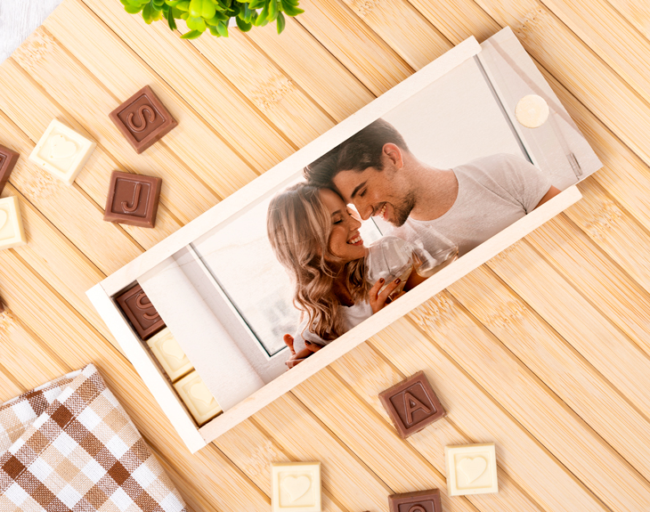 Nunca tu mensaje fue tan dulce. Envía un choco-mensaje en caja de madera y será inolvidable. Puedes elegir entre la caja personalizada con foto o sin personalizar. Tamaño de cada letra: 2,3cm x 2,3cm