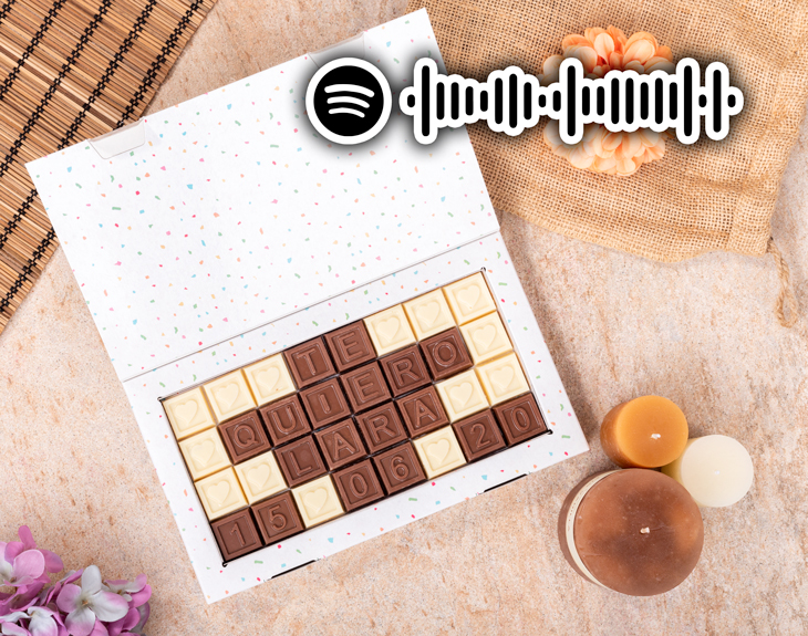Hay muchas maneras de decir las cosas más bonitas. ¿Por qué conformarte con escribir una tarjeta o un mensaje de What's App? Para emocionar de verdad a tu pareja o sorprender a tus amigos, puedes expresarles todo lo que sientes con este chocomensaje personalizado con caja de confetti. Cuando lo abran, descubrirán tu mensaje escrito con onzas de chocolate. ¡Con todos los números y letras disponibles! No solo podrás hablar con chocolate. ¡También puedes utilizar la música para expresar tus mensajes! Con tan solo añadir el producto al carrito y utilizar nuestro buscador, podrás insertar el código de onda de tu canción desde Spotify. Sea la canción que sea, mientras esté en la plataforma podrás añadirla como pegatina sobre tu preciosa caja colorida. Con muy esfuerzo, tendrás la doble sorpresa del mensaje de chocolate con ondas musicales. Por dentro y por fuera. ¿Cómo se personaliza? Únicamente tienes que decirnos el nombre de la canción, una vez lo hayas hecho te aparecerán todos los títulos relacionados, simplemente tienes que seleccionar la versión que quieras. Nosotros nos encargamos de generar el código de spotify para que puedas dar la mejor sorpresa de todas. ¿Cómo se escanea el código Para poder descubrir de qué canción se trata tendrás que abrir la aplicación de Spotify en tu teléfono móvil y darle al apartado "Buscar". En la parte superior encontrarás un buscador, cuando pulses sobre él verás que en la esquina derecha aparece un icono de una cámara. Al pinchar te abrirá la cámara, únicamente tienes que apuntar al código y automáticamente se reproducirá tu canción. Medidas: - Tamaño de cada letra de chocolate: 2,3cm x 2,3cm - Tamaño de la caja confetti: 23cm x 11cm x 2,5cm
