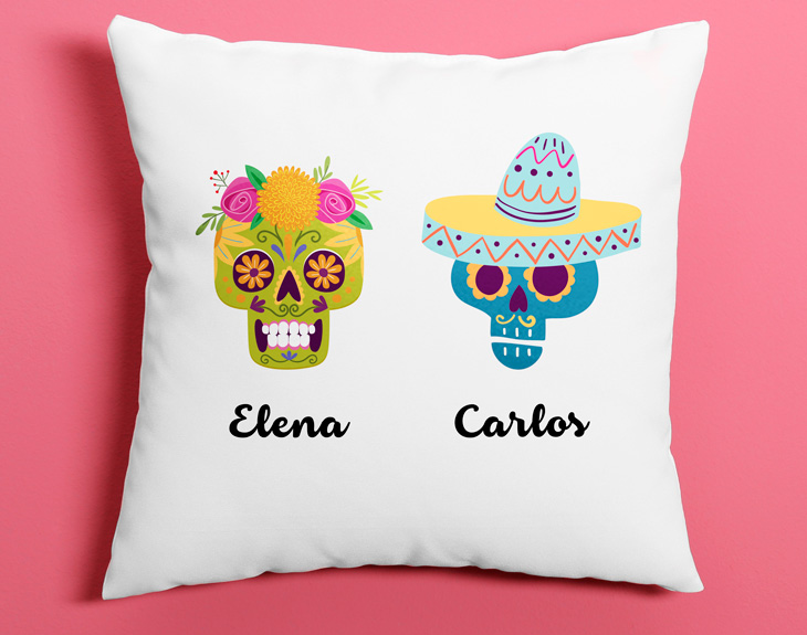 Si México es tu pasión, y la cultura mexicana lo es todo para ti, estas calaveras te encantarán. Además, podrás diseñar el cojín con las calaveras que quieras, y crear una familia o un grupo de amigos. Aprovecha para regalar este cojín personalizado a las personas que más quieres, y diseña el detalle con sus nombres. Tendrás disponibles hasta 85 calaveras diferentes, para que puedas elegir las que más te gusten. Con sombrero, con flores en la cabeza, al estilo vela... ¡Diseña el cojín más especial de tu vida! Importante: Con más de 6 personajes, éstos se imprimirán en dos filas en la taza. Es decir: • Familia de 6: 3 en la fila superior, y 3 en la inferior. • Familia de 7: 4 en la fila superior, y 3 en la inferior. • Familia de 8: 4 en la fila superior, y 4 en la inferior.