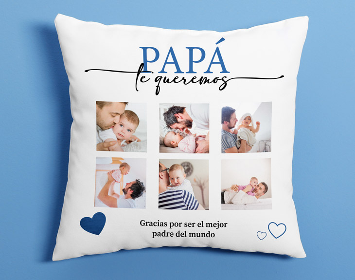 Papá siempre ha sido nuestro mayor apoyo... ¡Incluso cuando no teníamos uso de razón! ¿Quién ha sido la persona que nos ha cuidado y alimentado a lo largo de todos estos años? ¿Quién nos llevaba al parque a jugar cuando lo único que queríamos era un soplo de aire fresco? Está claro que nuestro padre ha sido un pilar clarísimo en nuestra vida. ¡Se merece todo lo bueno que le pase! Habrás compartido momentos inolvidables con el mejor papá del mundo mundial. Desde que tenemos uso de razón siempre ha sido la persona en la que fijarnos y apoyarnos a lo largo de nuestra vida. ¿Qué mejor regalo para él que un cojín personalizado con el que rememorar algunos de los instantes más bonitos de vuestra relación padre-hijo/a? ¡Un regalo de lo más personal! Este cojín collage para papá podrá contar con todos esos recuerdos que compartisteis juntos, desde tus primeros pasos hasta tus andaduras como adulta. Podrás personalizar este regalo original para padres y abuelos con vuestras mejores fotos. Añade el producto al carrito y entra en el área de personalización. ¡Solo tendrás que subir las imágenes al sistema y añadirlas a la plantilla! Finalmente, también podrás añadir una taza personalizada con el mismo diseño. ¡Podrás crear el pack completo! Importante: si eliges la opción que incluye taza, esta será de cerámica.