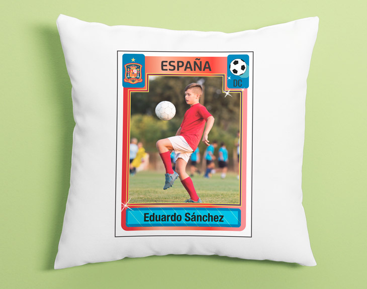 El fútbol está para compartirlo. Es un deporte que se disfruta tanto jugando como viéndolo en una gran pantalla o en el estadio rodeado de miles de personas. ¿A qué fanático del fútbol no le gusta reunirse con su familia y amigos para ver un partido de su equipo? Y es que es un deporte que une a las personas... si sois del mismo equipo, claro. Porque los futbolistas necesitan a su afición para darlo todo en el campo de juego. Si eres de los que ve los partidos desde casa, bien cómodo, este cojín personalizado es perfecto para ti. Seas del equipo que seas, no escondas tu pasión por el fútbol, porque ahora la puedes plasmar y personalizar sobre este original regalo. Es el detalle ideal para regalar a esa persona que es tan fanática del fútbol como tú y disfrutar muy cómodos de cualquier partido. Te acompañará en todos momento y lo mejor es que es muy blandito, perfecto para aguantar todo un partido. Como aquí todos los equipos de fútbol son válidos, queremos que puedas personalizar tu propio cojín a tu medida. Es muy sencillo. Podrás elegir la foto que quieras que aparezca en el cromo y además, varios textos para que pongas el nombre del país, la selección, el equipo o el nombre del jugador. Parecerá un cromo de verdad. Y si quieres hacer este regalo mucho más especial, te damos la opción de que puedas llevarte el cojín junto con una taza personalizada de la misma temática. Seguro que triunfas con estos dos accesorios y sorprendes a la persona que lo reciba. ¡Será el mejor regalo del mundo!