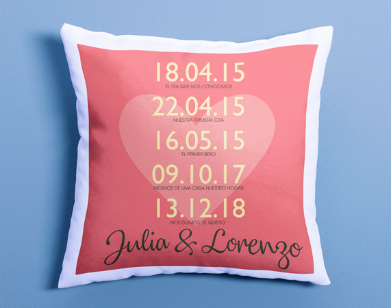 Seguro que si piensas en tu relación, en seguida te vienen a la mente cinco momentos únicos e irrepetibles. Inspirados en esos pensamientos, te traemos el cojín personalizado "Fechas inolvidables". En él, podrás crear un blandito y achuchable cojín con aquellos momentos que han marcado vuestra vida como pareja. Al adquirir el producto (y antes de pagar) podrás personalizar las fechas inolvidables y los nombres.