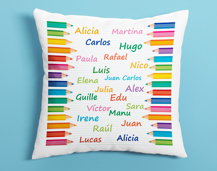¿Queréis sorprender a vuestro profe con un increíble regalo para agradecerle todo lo que ha hecho por vosotros durante este curso? Nuestro cojín personalizado "Lápices de colores" es el detalle perfecto Se trata de un increíble diseño en el que podréis poner el nombre de todos los alumnos para que se lleve un bonito recuerdo de vosotros...¡Se emocionará muchísimo al verlo! Además, es perfecto para demostrarle que valoráis muchísimo toda la dedicación, el cariño y la paciencia que ha puesto con vosotros.